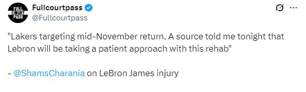 北京时间10月16日,湖人核心球星詹姆斯正在养伤,究竟他何时才能复出?据ESPN名记Shams报道,湖人计划让詹姆斯11月中旬复出,一位消息人士称,詹姆斯将耐心进行伤病恢复;詹姆斯伤停,湖人又添伤病,范德比尔特意外受伤退赛。