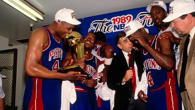湖人自毁长城,活塞笑纳大礼。 到了总决赛阶段,活塞队可谓占尽了便宜。由于在冲出西部的过程中,湖人取得了惊人的11连胜,而活塞则在东部和公牛陷入鏖战,所以距离总决赛开打,湖人拥有了10天的休整时间。但主帅帕特·莱利居然没有让球员们休息,而是每天都给到巨大的强度,让他们进行魔鬼训练。结果就是老将们不堪重负,球队的主力得分手拜伦·斯科特更是在训练中重伤报销,而魔术师、贾巴尔和詹姆斯·沃西也是状态全无。 而状态正盛的活塞队抓住了千载难逢的机会,首场托马斯和杜马斯合砍46分,带领球队轻松取胜。第二场虽然6人得分上双,但湖人队却因为体力不支在末节崩盘,杜马斯和托马斯再度拿下54分,取得了系列赛的先机。第三场魔术师彻底支持不住了,只打了5分钟便因伤无法坚持,虽然沃西和贾巴尔拿下了50分,但活塞队已经不可阻挡,杜马斯和托马斯完全打爆了湖人的后卫线,二人拿下了57分,在末节再度建立优势,拿到了总决赛的赛点。 最后一场比赛,湖人这边虽然沃西独得40分,但全队已经被消磨殆尽,活塞队则全场占尽优势,杜马斯拿下23分,全队6人得分上双,最终完成了横扫,击败了湖人队,拿到了队史的第一座总冠军。