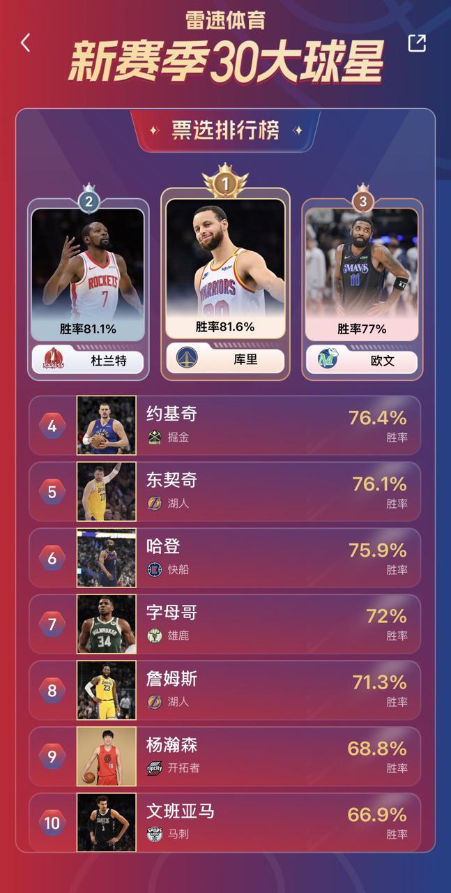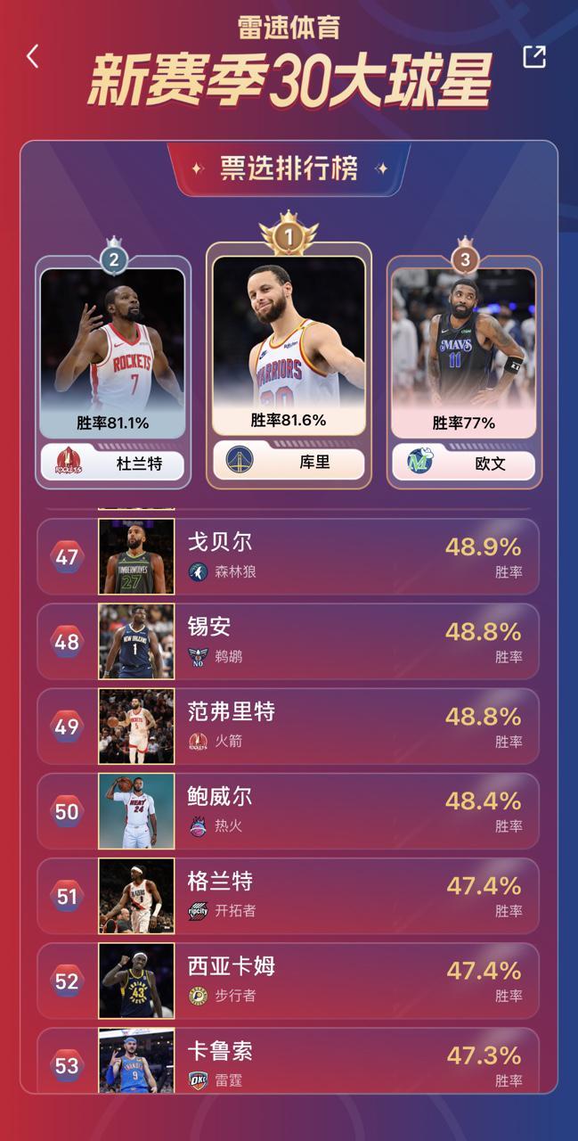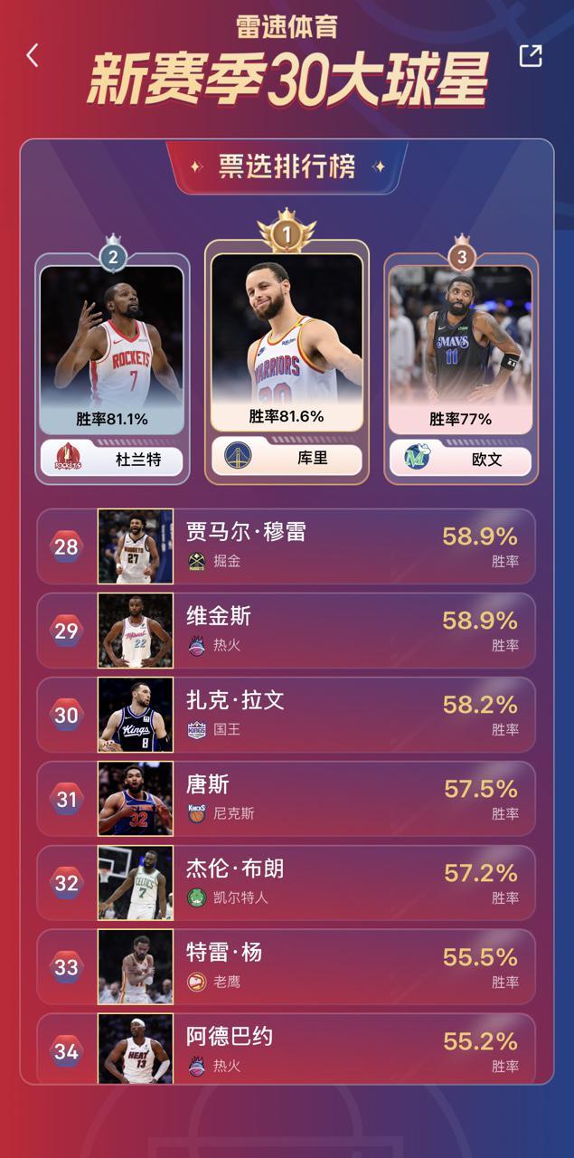 雷速NBA新赛季30大球星即时排名:库里反超KD升至