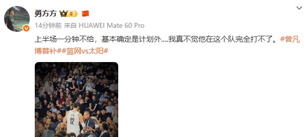 雷速体育10月12日讯 今日NBA季前赛中国赛继续进行,篮网与太阳进行第二次交手,上半场中国球员曾凡博未能获得任何出场时间。 北京媒体人“勇方方”评论表示:上半场一分钟不给,基本确定是计划外.,我真不觉他在这个队完全打不了。 |