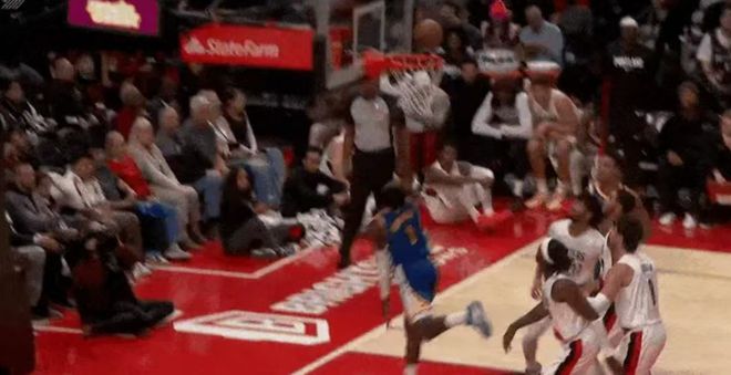 库明加本场比赛被安排首发登场比赛,他在第二节比赛进行到后半段还剩0.9秒时刻,库明加突破上篮被干扰未能命中,反而是开拓者成功打反击得分。