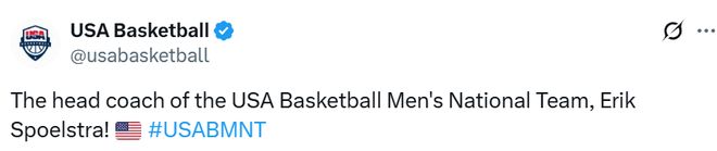 除了以助理教练身份随队夺得2024年巴黎奥运会金牌外,斯波尔斯特拉还曾在2023年国际篮联男篮世界杯期间担任史蒂夫-科尔的助理教练,彼时美国队获得第四名;2021年,他还担任美国男篮选拔队主教练,该队伍在2020年东京奥运会前曾与美国男篮国家队一同训练。 “被任命为美国男篮国家队主教练,对我而言是莫大的荣誉,”斯波尔斯特拉表示,“代表国家、带领世界级运动员征战顶级赛事,是体育领域最珍贵的机会之一。我期待延续美国篮球所秉持的卓越传统与团队精神。”