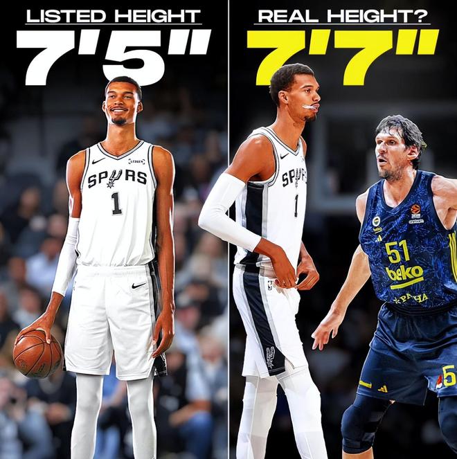 那我们该找个真正的“巨人”来对比啊!博班-马扬诺维奇——这位身高2米24、还演过《疾速追杀3》的前NBA大个子球员,最近在ESPN的节目中提到,他站在文班亚马面前,需要“抬头看他”。 ESPN记者文霍斯特甚至认为,文班亚马的身高可能已经高达2米31。如果真是这样,那他和马刺队“最佳新秀四人组”的合影就说得通了。 身高数据24小时内“缩水”? 再说说马刺队对这位大个子的身高标注。 本周早些时候,大家还在惊讶于马刺队将文班亚马的身高列为2米26。独行侠队的莱夫利在媒体日也透露,自己的身高从之前的2米16长到了2米18。年轻人在十八九、二十出头的年纪还在长个子,这种情况并不罕见。但没过多久,文班亚马的身高数据又变了。