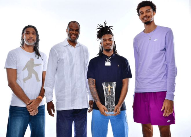 搞清楚他的身高有什么意义?其实没什么实际意义,但正因为如此,讨论这件事才特别有意思。球员或球队“错报”身高,本就是NBA的趣味环节之一。我们会好奇以赛亚-托马斯到底是1米75,还是测量时踮了脚尖;而当一个大个子球员不愿被报太高时,情况就更有意思了。 已故的传奇教练菲利普-桑德斯曾开玩笑说,凯文-加内特不想被列为7英尺球员,所以他会调侃“加内特身高6英尺13英寸(约2米21,实际是用夸张方式暗示其身高超7英尺)”。 其他人对文班亚马的身高有什么说法?今年5月初,我们在The Bounce栏目中发现了一张有趣的照片:斯蒂芬-卡斯尔(NBA最佳新秀)与其他曾获此奖项的马刺队球员同框,除了卡斯尔,还有文班亚马、蒂姆-邓肯和大卫-罗宾逊。但没人关注卡斯的高光时刻——因为文班亚马和另外两位大个子的身高差距实在太悬殊了。
