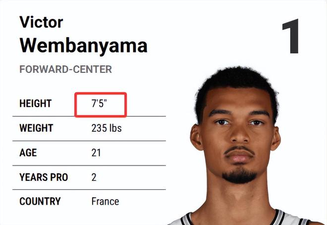 2011年,迈克尔-比斯利还在森林狼队时,记者曾在更衣室问他:“杜兰特真的只有2米06吗?”当时身高同样被列为2米06的比斯利性格活泼,他直言:“要是杜兰特身高2米06,那我顶多也就1米96。”记者不确定比斯利是不是真的算过这个“账”,但他这话显然在暗示,杜兰特的实际身高可能更接近2米16。 文班亚马身高数据反复变动 文班亚马在NBA的前两个赛季里,身高数据像拳击手赛前减重、随后又靠碳水化合物增重一样,变动得十分频繁。选秀时,他的身高被报为2米26;新秀赛季,数据变成了2米24;二年级赛季又降到2米21;如今即将开启第三个赛季,身高数据又回到了2米24。然而就在本周,他的身高数据又出现了新的数据:2米26。 那么,文班亚马到底多高?The Athletic用“自问自答”这种老派方式,在网上找找线索。 你觉得文班亚马实际多高?我觉得他至少有2米26,而且我甚至不打算接受比这个“矮”的数值。