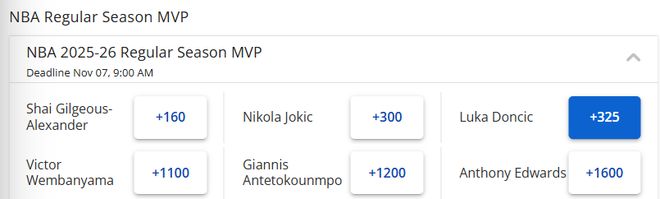 最新MVP赔率显示,东契奇是+325,暂列第三,但已经非常接近第二的约基奇(+300),而亚历山大(+160)目前排在榜首。 |