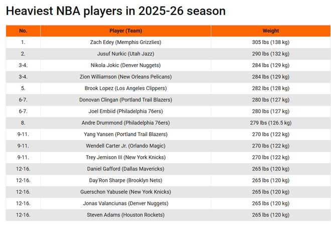 NBA球员体重排名:杨瀚森122公斤第九,扎克·埃迪