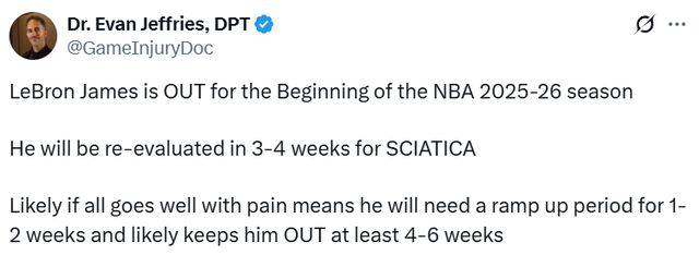 即将开启个人NBA历史第23个赛季的詹姆斯,将因这次伤病,被迫缺席球队的新赛季开局的比赛。湖人队表示,未来3至4周内不会对他的伤情进行重新评估。 美媒表示,坐骨神经痛的症状是疼痛起源于脊柱,并向下放射至腿后,其症状表现为疼痛、无力,有时还会出现麻木感,通常由坐骨神经受损或受伤引起。医学专家表示詹姆斯预计还需要1至2周的恢复训练期,这可能会让他最终至少缺席4至6周。