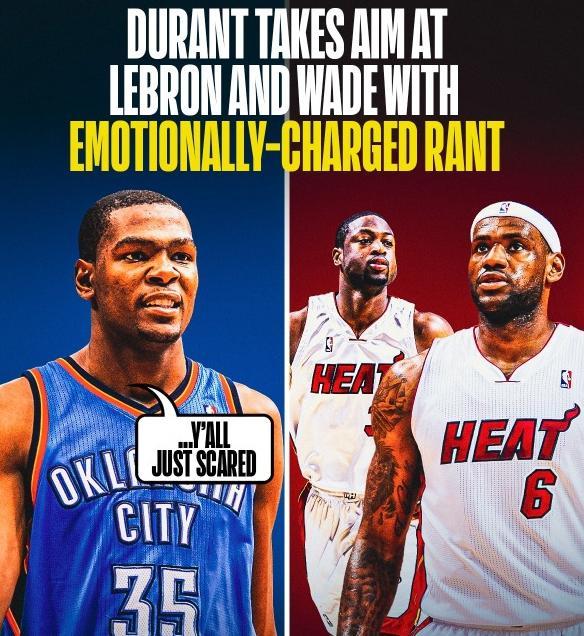 杜兰特认为当时詹姆斯和韦德这些人恭喜哈登去火箭能大杀四方,是因为他们害怕我们(雷霆三少)即将统治NBA!(在回答问题时,杜兰特狂飙脏话,显然是对詹姆斯的行为很不满!) 对于这次交易,哈登自己也不理解,他认为过去三年球队取得长足进步,虽然在总决赛不敌热火时的詹姆斯,但球队一切都在朝好的方向发展,哈登认为一定能在雷霆夺冠,结果因为被交易,一切都化为泡影。