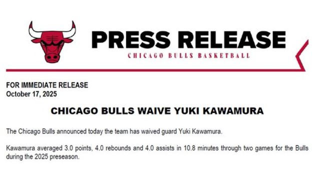 公牛官宣裁掉河村勇辉!季前赛场均3+4+4 目前受