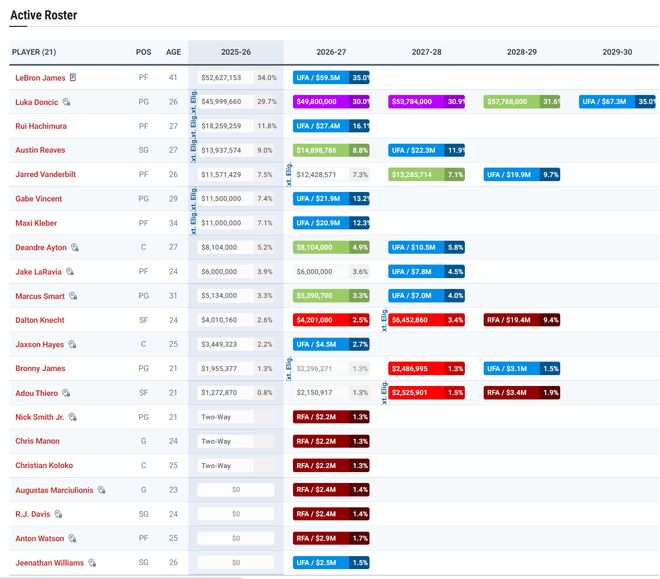湖人队裁掉这4人后大名单回归14+3: 詹姆斯、东契奇、八村垒、里夫斯、范德比尔特、文森特、克勒贝尔、艾顿、拉拉维亚、斯马特、克内克特、海斯、布朗尼、蒂耶罗;科洛科、马农、小尼克-史密斯(三个双向合同)