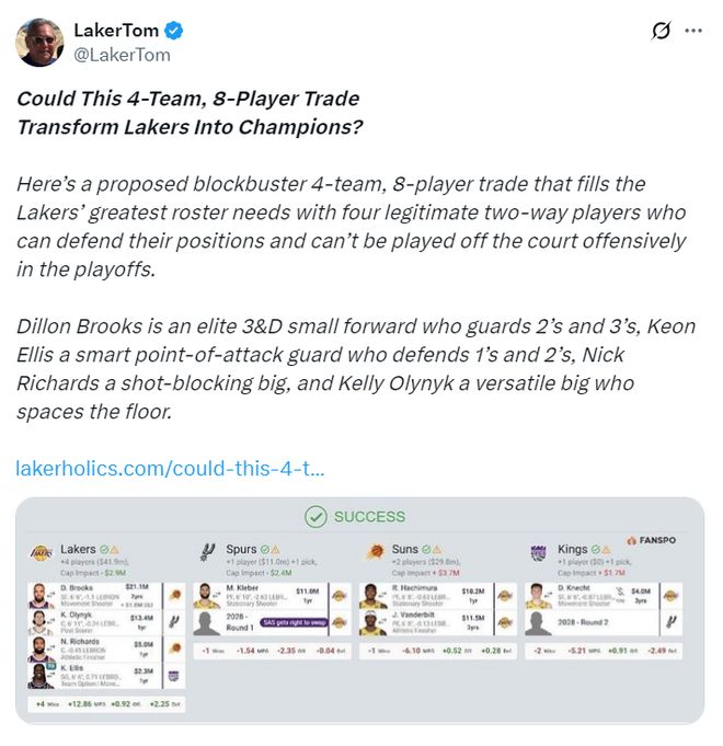 他列举了一套四方大交易方案:马刺、湖人、太阳、国王,这笔交易湖人就可以得到四个新援: 湖人得到:狄龙、奥利尼克、理查兹、埃利斯; 马刺得到:克勒贝尔、2028年湖人首轮互换权; 太阳得到:八寸垒、范德比尔特; 国王得到:克内克特、马刺2028年次轮签;