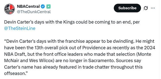 雷速体育10月19日讯 据知名账号NBACentral援引名记Marc Stein的报道称,国王13号秀德文·卡特在球队的日子即将结束。 Marc Stein说道:联盟消息人士透露,尽管德文·卡特在2024年选秀时高居第13顺位,但当初做出这一选择的总经理蒙蒂·麦克奈尔和韦斯·威尔考克斯已离开萨克拉门托。据悉,卡特的名字已频繁出现在今年休赛期的交易流言中,他在国王的日子可能即将结束。 随着威少的加盟,国王在后卫线上的人手更加充足,更挤压了德文·卡特的生存空间。上赛季,德文·卡特场均可以得到3.8分2.1篮板1.1助攻。 |