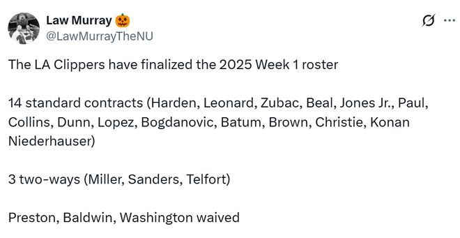 特尔福特参加了快船队3场季前赛,在约29分钟的出场时间里总共得到9分。但球队最终决定留下他,而非普雷斯顿、鲍德温和华盛顿——这三人都拥有NBA经验,且均持有Exhibit 10合同。据默里补充报道,特尔福特近几周凭借球商、防守积极性、多功能性和坚韧表现,给球队留下了深刻印象。 若普雷斯顿、鲍德温和华盛顿今年秋天前往圣迭戈快船队(快船队下属发展联盟球队)报到,并在该队效力至少60天,每人将有资格获得一笔价值85,300美元的奖金。 快船队目前的薪资非常接近硬工资帽,无法以满额阵容开启新赛季。在上述操作完成后,快船队将拥有14份标准合同和3份双向合同。 快船14+3阵容具体如下—— 标准合同14人:莱昂纳德、哈登、科林斯、祖巴茨、博格丹、小琼斯、大洛佩斯、巴图姆、邓恩、比尔、尼德豪泽、科比-布朗、保罗、卡姆-克里斯蒂 双向合同3人:乔丹-米勒、桑德斯、特尔福特 |