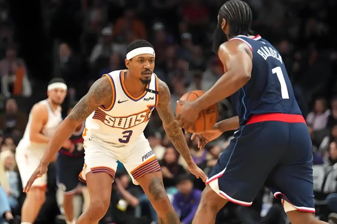或许这才是快船真正需要头疼的地方。 从球星资历来说,比尔确实配得上首发。作为曾经的全明星后卫,上赛季饱受诟病之外,但依旧交出场均17.6分4.3助攻3.9篮板,外加50.5%的命中率和40.7%的三分命中率,仅看数据单,这样的发挥怎么看都是首发级别。 但问题在于,纸面数据掩盖不了事实,比尔这两年在太阳的表现属实有些高薪低能了,伤病拖累让他缺席了58场比赛,防守端也是对手提款机。而快船签他,无非是想补足外线投射和持球火力,但不要忘记了,这支球队已经有了一个同样需要球权、同样防守不好的哈登。 当两个都要球权的后卫凑在一块,听起来像是进攻火力翻倍,但实际上更可能会是二人互相抢饭吃的尴尬局面。