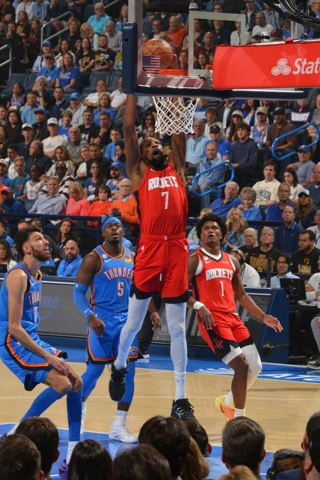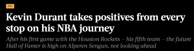 杜兰特是7月13日一笔涉及13名球员、7支球队的交易中的核心人物,这也是NBA历史上规模最大的一笔交易。在2024-25赛季,也就是他效力太阳队的第二个赛季、同时也是最后一个赛季,杜兰特场均能得到26.6分。但他与德文-布克、布拉德利-比尔组成的太阳队不仅未能进入季后赛,前一个赛季还在首轮惨遭横扫。太阳队甚至在去年赛季的交易截止日期间,曾考虑过交易杜兰特。 回顾在太阳队的时光,杜兰特表示自己对太阳队并无怨恨。 “我不会说那段经历是种挑战。我可是在NBA打球,”杜兰特说,“我当时身体状态依然良好,既能继续打磨球技,也能在比赛中全力以赴。我不会用负面的眼光看待那段经历。能在NBA打球,我任何时候都感到开心。我喜欢在菲尼克斯打球,曾以为自己会在那里退役。现在我也喜欢在休斯顿打球。” “所以,我能从每一段效力经历中汲取积极的东西。而且自从进入联盟以来,积极的经历远比负面的多得多。” 火箭队是杜兰特效力的第五支NBA球队,此前他曾先后为西雅图超音速队/俄克拉荷马城雷霆队、金州勇士队、布鲁克林篮网队和菲尼克斯太阳队效力。对于加盟火箭队这件事,主教练乌度卡是重要的吸引力之一——两人此前曾在美国男篮有过合作经历。 其他吸引杜兰特的因素还包括:能与申京、资深控卫范弗利特、潜力新星侧翼汤普森,以及前雷霆队队友亚当斯等人并肩作战。火箭队上赛季在西部联盟排名第二,外界普遍认为,随着杜兰特的加盟,他们将立即成为总冠军的有力竞争者。此外,身为篮球历史爱好者的杜兰特,也为能穿上与奥拉朱旺、德雷克斯勒、姚明、麦迪、卡尔文-墨菲和埃尔文-海耶斯等名人堂成员同款的火箭队球衣而感到自豪。 “这太不可思议了。我一直以来最喜欢的一些球员都曾为火箭队效力,他们为火箭队奠定了基础,也助力打造了球队品牌,”杜兰特说,“能成为其中的一员,意义重大。” 然而,范弗利特的赛季很可能还未开始就已结束——他在巴哈马进行的球队休赛期训练中,遭遇了右膝前交叉韧带撕裂。37岁的杜兰特表示,听到这个消息时他“非常沮丧”,揭幕战中,范弗利特的缺席带来的影响显而易见:杜兰特仅出手16次,火箭队全场出现21次失误,且在加时赛末段,由于汤普森因抽筋提前离场,球队陷入了缺乏场上指挥官的困境。 “他(范弗利特)本来对能加入这支球队感到很兴奋,”杜兰特在谈及范弗利特时说,“他甚至接受了降薪来留在队里。他是球队的老将,也是更衣室领袖,本应有很多机会展现自己的球技,也能获得更开阔的进攻空间。这对弗雷迪来说很艰难,但他很顽强,是个成熟的男人。他说‘别为我感到难过,我每天都会来训练,很快就会康复’。” “这就是他的心态。他必须继续坚持训练。”