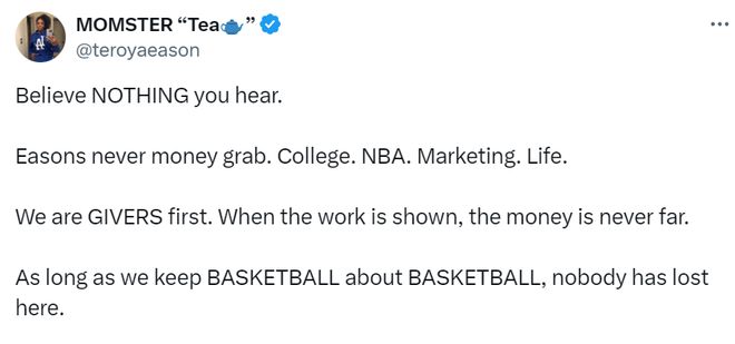 伊森续约失败后,有一些关于他们家太贪财的传言。伊森的母亲特罗亚-伊森在社交媒体上也就此事发声回应。 她写道:“别相信你听到的任何传言。伊森家的人从不贪图钱财——无论是上大学、打NBA、做商业推广,还是生活中,我们始终把‘付出’放在第一位。只要展现出实力,财富自然会随之而来。只要我们始终专注于篮球本身,就没有人会是输家。” |