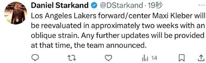 湖人目前遭遇伤病麻烦,核心之一的詹姆斯因为右侧坐骨神经痛,将缺席赛季初期的比赛,预计会在11月中旬复出。至于新秀阿杜-蒂耶罗因为左膝手术康复,也是持续高挂免战牌。 如今克勒贝尔成为湖人又一位伤员,他在此前的季前赛仅出战对阵国王的比赛,且仅出场了10分钟得到3分。
