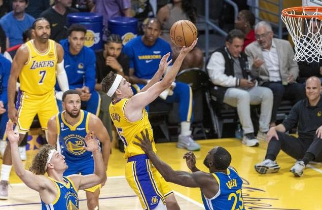 第三节勇士掌控节奏,库明加开场连得5分,东契奇连得4分回应,但勇士巴特勒与库明加联动,打出18-4将分差扩至15分。东契奇打成2+1追分,小佩顿暴扣、库明加三分助勇士扩至17分优势。湖人连追6分,希尔德三分回敬;双方对攻后湖人再追6分,勇士仍握主动权,单节净胜10分,90-79领先三节。 末节勇士斯马特抛射带队连得5分,分差扩至14分;里夫斯2+1止血,勇士再打5-0扩至16分。东契奇开启追分模式,率队打6-2,理查德三分助勇士保15分优势。比赛后段,斯马特三分命中,东契奇、艾顿与里夫斯带队打9-0缩至6分,勇士暂停。暂停后格林关键三分稳住局势,库里封盖文森特、巴特勒反篮助勇士重获10分优势。里夫斯连得5分、东契奇抛射缩至7分差,终场前51秒,库里超远三分杀死悬念。湖人虽再追分,终难逆转,勇士获胜。