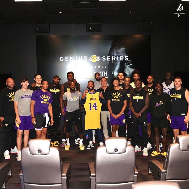 但威少根本不信。对他来说,这只是詹姆斯“言行不一”的又一个例子。早在前一年12月,威少就曾对记者说:“大家都在说‘让威少做自己’,但我觉得没人真懂这话什么意思,只是随口说说而已。”这话明显针对詹姆斯,赛季结束后被问及詹姆斯反复提这句话时,威少更是强硬表态:“这不是真的,咱们得说实话。” 威少早就了解詹姆斯的“名声”——他见过太多詹姆斯“自我包装”的例子:詹姆斯曾称《教父》是自己最爱的电影,却在记者让他说一句台词时答不上来;他曾带着《马尔科姆-X自传》参加媒体发布会,被问最大收获时却语无伦次;还有一次采访中,他说科比单场81分时,自己提前预测科比能得70分,这段视频因太过荒谬成了热门表情包。詹姆斯“夸大其词”的名声太广,甚至在他自己参与制作的节目里也被调侃——2022年11月,杰克逊维尔美洲虎队角卫杰伦-拉姆齐在詹姆斯与马弗里克-卡特的媒体公司制作的脱口秀《The Shop》中直接问他:“他们说你总爱吹牛,是真的吗?” 在威少看来,这就是真实的詹姆斯,而他已经受够了。 威尔-史密斯探访:矛盾爆发 输给开拓者两天后,湖人全队在训练馆集合,佩林卡告知球员会有一位特殊嘉宾来访——他打造了一个“天才系列”活动,邀请各领域名人(如“巨石”强森、肯德里克-拉马尔、埃隆-马斯克)来和球队交流,这次请来的是好莱坞一线明星威尔-史密斯(当时距离他在第94届奥斯卡掌掴克里斯-洛克仅过去6个月)。