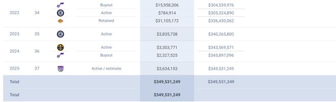 10月18日,国王VS湖人完成季前赛后,国王新援拉塞尔-威斯布鲁克在场边为球迷签名,雷霆球衣、火箭球衣、湖人球衣都有,少爷为球迷签名时唯独跳过了湖人球衣。这个举动引发了热议。 威少在2021年夏被交易到湖人,那一年他年薪4400万湖人全额支付,2022-2023赛季湖人将他交易到爵士队,湖人支付了他3110万的薪水,爵士支付1595万的薪水,湖人钱给足了为何少爷还是对湖人耿耿于怀呢? 大家可以看看威少离开湖人后他的薪水下滑有多么严重!22-23赛季他被湖人交易到爵士后遭到裁员,随后威少以一年78万的合同加盟快船,在快船打了半个赛季后2023年夏与快船签下两年780万。 2024年快船又将威少送到爵士,爵士第二次裁掉他,他又跟掘金签下两年670万的底薪,今夏他拒绝掘金的球员选项成为完全自由球员。 虽然在掘金的数据并不差,可自由市场却鲜有球队跟威少联系起来,最终威少一年360万加盟国王,注意这份老将底薪还是不保护的,国王可以随时裁掉威少。 换言之从湖人离开后威少实际上赚到的薪水只有78万+383万+562万+360万(不保障),合计只有1383万,这里面还有360万不知道能不能全额拿到,威少从一个年薪4000+万的超巨沦为联盟的边角料。 雷霆三少,杜兰特37岁还签下两年9000万的提前续约,余下三年合同高达1.447亿;36岁的哈登还与快船签下两年8150万的续约合同,而还没年满37岁的威少底薪都已经不保障了。 根据克里斯-海恩斯的报道,威少无意在新赛季结束后退役,这或许已经是少爷最后的倔强了。 |