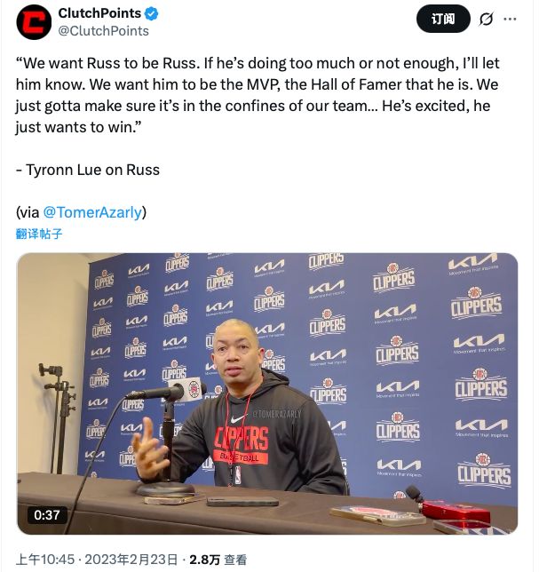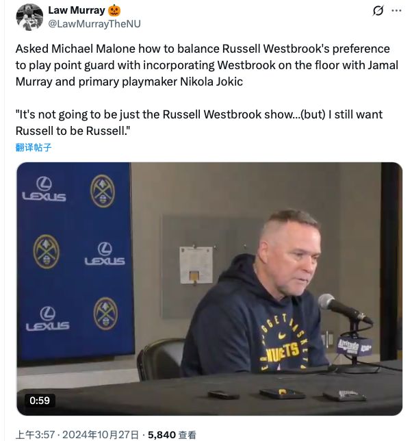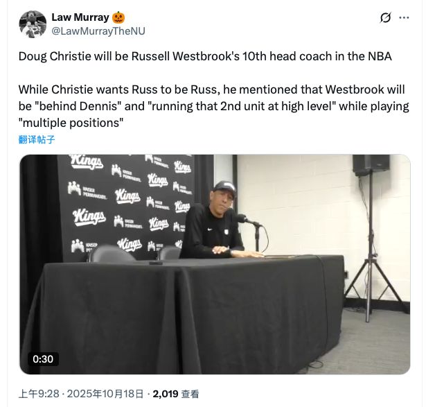 雷速体育10月20日讯 美媒NBA Memes今日更新社交媒体,发文调侃了威少: “快船主教练泰伦·卢在2023年说:我们希望威少做自己;掘金前主教练马龙在2024年说:我依然希望威少做自己;国王主教练克里斯蒂在2025年说:我只希望威少做自己!我们好像陷入了循环!” 2023年交易截止日前,威少与爵士达成了买断,随后底薪加盟快船,在新闻发布会上,快船主帅泰伦·卢说:“我们希望威少做自己。如果他做得太多或不够,我会告诉他。我们期待他展现出MVP级别、名人堂级别的实力,同时也要确保这建立在团队协作的基础上,他现在充满干劲,一心只想赢球。” 2024年休赛期,威少加盟掘金,赛季初的一次新闻发布会上,球队主帅马龙谈到威少与约基奇、穆雷如何共存时表示:“这不会变成威少的个人秀……我依然希望威少做自己。” 威少近日加盟国王,在新闻发布会上,国王主帅克里斯蒂表示:“我只希望威少做自己,这就是最重要的事情,就是做那个完整的威少。” |