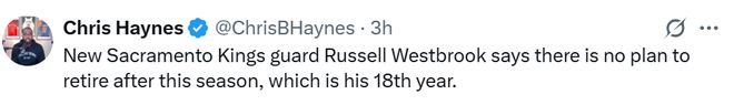 雷速体育10月20日讯 据名记Chris Haynes报道,国王新援卫威斯布鲁克在接受媒体采访时表示,目前并无在本赛季结束后退役的打算。 国王将是威少生涯效力的第7支球队,同时本赛季将是威少在NBA效力的第18个赛季,此前他与国王签下了一份一年363万美元的底薪无保障合同。 |