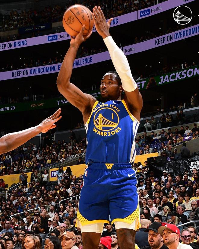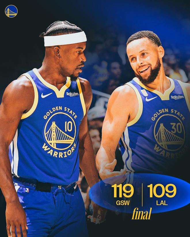 东契奇上篮得分,斯马特2罚全中,艾顿中距离取分,里夫斯罚中1球,湖人轰出了7比0的攻势还以颜色。希尔德外线取分,东契奇、库明加各有单打命中,东契奇被封盖,巴特勒2罚全中。拉拉维亚与希尔德外线对轰,东契奇抛投得分,随后助攻海斯压哨空接打进。理查德压哨抛投得分,拉拉维亚补篮得手还以颜色,第3节打完,勇士以90比79领先,湖人单节以25比35落后,东契奇、库明加单节各自砍下13分。 末节决战,斯马特抛投命中,希尔德回敬三分球。格林大帽范德比尔特,随后命中2+0,里夫斯打成了2+1予以回应。希尔德继续远投发难,巴特勒抛投得手,勇士取得16分领先。东契奇抛投得分为湖人打破僵局,库明加助攻霍福德在篮下得手,艾顿、东契奇相继在禁区得分,科尔请求暂停。理查德轰进远投,斯马特外线取分,东契奇、艾顿、里夫斯相继冲击篮下得手,湖人轰出了9比0的攻势,科尔继续请求暂停。 库里与格林击掌