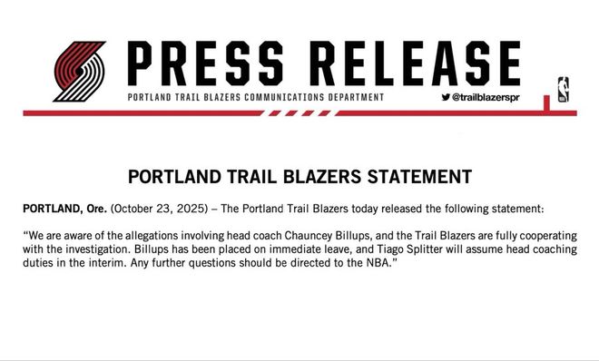 开拓者官方声明:即日起暂停比卢普斯职务,斯