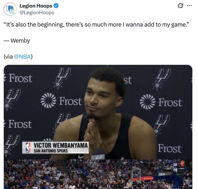 公开展露野心 文班亚马本人在打出如此傲人的表现后,也丝毫不遮掩自己的野心,公开表示自己必须要做出一个声明,我们已经厌倦了输球。 谈到个人表现时,文班亚马坦言自己今夏真得非常努力,本场比赛只是个开始,自己还有很多东西会继续加入到比赛中,这需要一些时间,顺其自然就好。 期间文班亚马也谈到休赛期前往少林寺训练,坦言这段经历提升了自己的身体机能,寻找奥拉朱旺特训改善了自己的进攻能力,并且这些经历为自己带来的帮助远超篮球本身。