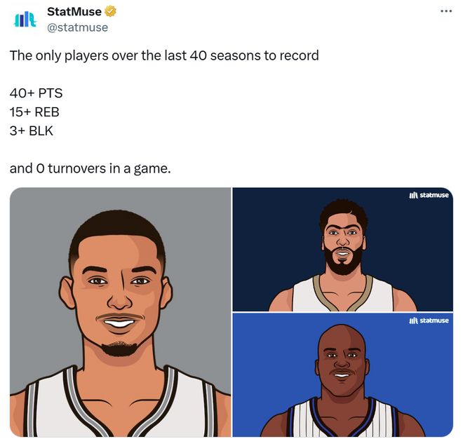 文班首秀即爆发 由于比赛早早一边倒,面对提前放弃的独行侠队,文班全场仅出战29分40秒,但凭借21投15中的夸张效率,爆砍40分15篮板1助攻1抢断3盖帽炸裂数据。 要知道文班亚马本场对位的球员并非无名鼠辈,而是稳定的DPOY级别防守者浓眉哥,数据含金量可谓是拉满。 正如名记Siegel赛后点评所说,浓眉哥这名历史最佳防守者之一,现役最好的内线防守人,本场被文班亚马直接打成了漏洞百出的路人甲。