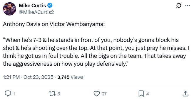 这并非是夸大文班的表现与贬低浓眉哥的防守,而是双方在场上实打实对位过程中碾压式差距的直观展现。 赛后浓眉哥也无奈表示:“当一个身高差不多2米21的人站在你面前时,没人能够对其完成封盖,他就在你的头顶出手,而你只能祈祷他投进,除此之外,你无可奈何。”