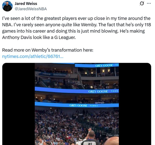 美记Jared Weiss也发文感叹文班亚马首秀恐怖的表现,直言自己看过很多NBA球员打球,但从没有见过文班如此罕见的存在,他才打了118场比赛,就让对位的浓眉哥看起来像是G联赛球员一样。