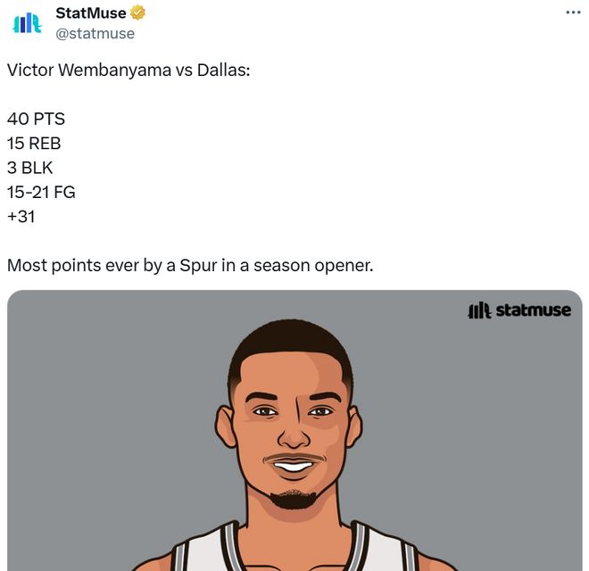 在DPOY级别防守者浓眉哥头上爆砍40+15,马刺队真核文班新赛季真变“武班”!首秀刷爆纪录后还不忘加练俯卧撑。