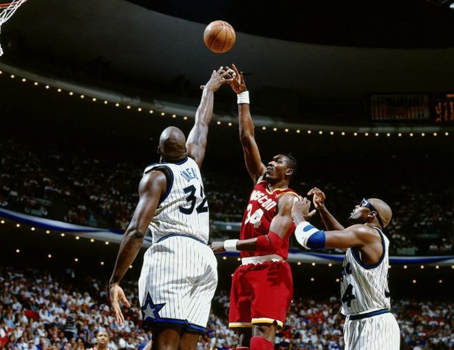 奥拉朱旺 奥拉朱旺是NBA史上被包夹频率最高的中锋之一。1995年总决赛对上魔术,遭遇奥尼尔和霍勒斯·格兰特的双人包夹,包夹比例高达71%。 当时超音速开发出一种SOS防守战术。1996年季后赛对火箭,他们甚至在无球状态下就发起包夹,结果系列赛首战奥拉朱旺仅出手7次,只得到6分。 根据NBA数据统计,他整个职业生涯有24.7%的进攻回合遭遇包夹,超越了奥尼尔的22.5%。