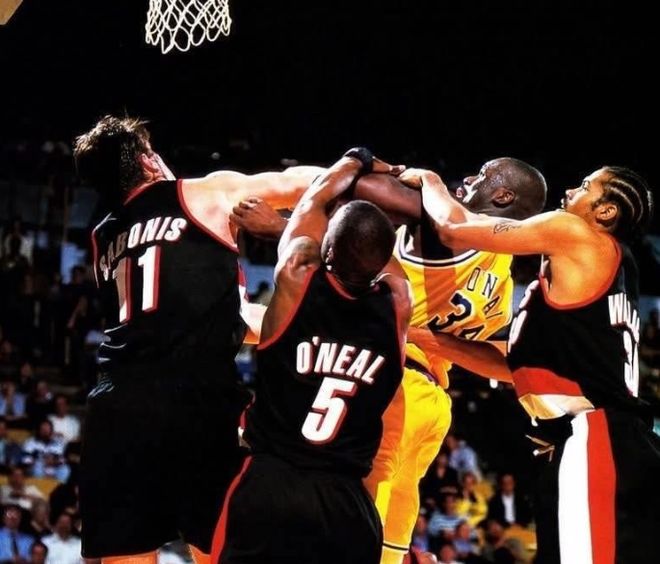 奥尼尔 魔术时期,公牛对付奥尼尔的方法之一,是先由卢克·朗利顶防,随后由乔丹视情况切球或从后方封盖,有点类似于1998年时罗德曼顶防卡尔·马龙,而乔丹伺机下手的战术。 到了湖人时期,马刺开发出砍鲨战术: 鲍文故意放松对科比的防守引诱传球,一旦奥德尔完成第一下运球后,鲍文迅速从侧面夹击,和邓肯形成三角包夹。如果战术失效,则立刻使用砍鲨战术。 2000年西部决赛,开拓者甚至不惜使用四人收缩来应对,只要奥尼尔一接球,就有四名球员同步压迫禁区。正因这种极端防守,联盟在2001年出台了防守三秒规则,甚至放宽区域联防,也间接导致传统中锋走向没落。