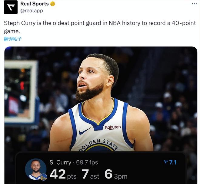 库里又创造了奇迹,37岁236天的他成为NBA历史上单场砍下40+最老的控卫。这是库里生涯第72次砍下40+,追平了杜兰特,并列NBA历史40+场次榜第9位。这是库里在30岁之后第42次砍下40+,排名NBA历史第二,仅次于乔丹的44场。 37岁的库里在新赛季依然状态神勇。都说詹姆斯是不老传奇的代表,库里也在书写属于他的传奇篇章,他的持久力同样属于历史级别。