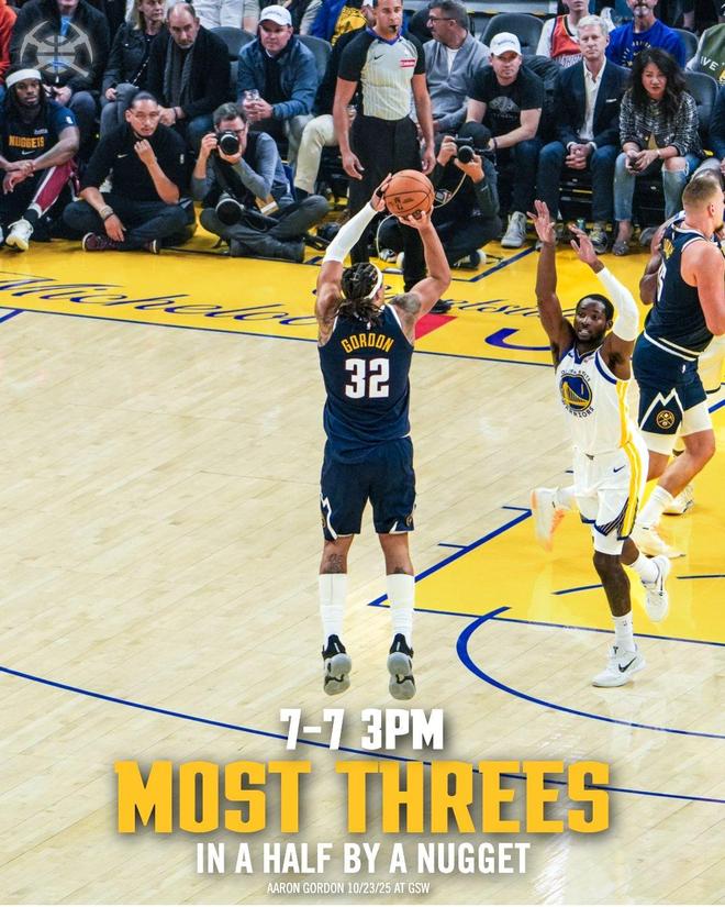此役,阿隆戈登刷爆了纪录。第1、戈登此役的得分创下生涯新高(此前最高41分)。第2、戈登三分球命中数(10个)创下生涯新高。第3、阿隆-戈登创掘金队史揭幕战得分新纪录。第4、戈登轰下本赛季常规赛第2个50+。第5、此役戈登的真实命中率高达105.8%,是历史最高效的50分先生。 此役,戈登还创下了NBA历史第1的神迹。上半场,阿隆戈登三分球7中7,砍下两队最高的25分外加2板1助。 戈登上半场三分球7中7