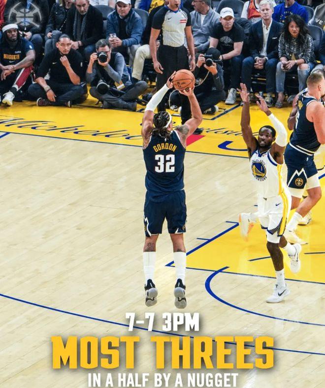半场数据,掘金队这边,阿龙-戈登出战15分钟,8投7中(三分7中7),砍下25分2篮板1助攻,创下个人生涯半场得分新高纪录,也同时超越贾马尔-默里的6记创造掘金队史新纪录,还追平了NBA历史上半场以100%命中率投进的三分纪录;约基奇出战17分钟,8投5中,三分5中2得到14分7板5助攻1盖帽;穆雷出战15分钟,9中6得到12分2板6助攻3抢断。 勇士队这边,库里出战16分钟,8投3中,三分5中1得到7分2板6助攻1抢断;巴特勒出战16分钟,8中4得到11分3板1助攻2抢断。