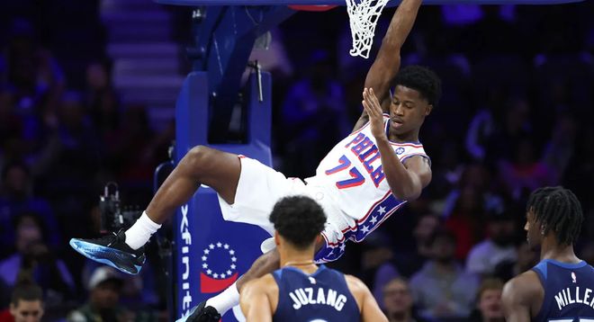 当费城76人与波士顿凯尔特人的新赛季揭幕战终场哨响,记分牌上117-116的数字定格时,所有人的目光都越过了豪取40分的马克西,也越过了被摁在替补席的恩比德,聚焦在那个身披76人球衣、刚打完NBA生涯第一场常规赛的巴哈马少年身上——VJ・埃奇库姆。26投13中、三分13投5中,狂揽34分7篮板3助攻1抢断,这样的首秀数据足以让联盟为之震动,更颠覆性的是,当球队核心恩比德以9投1中、仅得4分的低迷表现提前“打卡下班”时,正是这位新秀扛住了压力,与马克西联手掀翻了缺少塔图姆的凯尔特人。这场焦灼的险胜,不仅是76人的赛季开门红,更像是一次“权力交接”的预演:这个刚登陆NBA的探花,这一战让球队老大为自己打副手,他的上限又能达到怎样的高度?