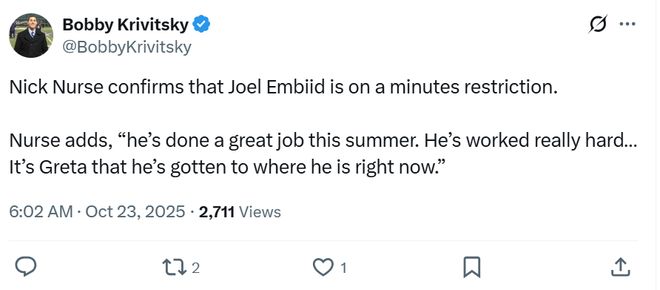 伤病毁掉MVP 正如美媒《BrickCenter》所说,恩比德作为昔日的MVP大热,之所以表现如此糟糕,完全是因为膝盖伤病困扰。 要知道在22-23赛季,恩比德还是一名与现役即战力第一人约基奇一时瑜亮的超级巨星,当赛季场均轰下33.1分10.2篮板4.2助攻1.0抢断1.7封盖夸张数据。 无奈的是,过去两年恩比德连续遭遇膝盖重伤打击,先是在24年1月份遭遇左膝半月板损伤长期缺阵,接着在25年3月份再次因左膝伤情赛季报销,并于4月份接受左膝关节镜手术。