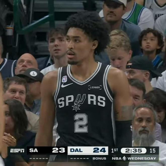 本场比赛,马刺队在今年选中的榜眼秀迪伦-哈珀迎来了自己职业生涯的常规赛首秀,全场比赛他替补出场22分41秒,14投7中得到15分4篮板2助攻,三分球2中1,罚球2中0,出现了4次失误5次犯规,正负值+5。 在第二节,哈珀拿出了全场的最佳表现,他单节5中4得到了8分1篮板。 |