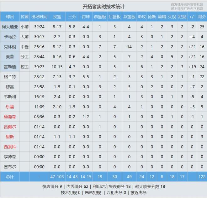 第四节霍勒迪两记三分,开拓者领先到18分。克林根二次进攻得手,防守端大帽里夫斯。杨瀚森的护框和防守,和克林根还有不小差距。最后1分14秒,垃圾时间杨瀚森再次登场,但没机会触球。全场结束,开拓者122-108大胜湖人。 里夫斯41分4板5助3断,背靠背51+41,一共轰下92分。艾顿16分8板2助2断;克林根16分14板2助2帽。开拓者新主帅斯普利特说:“理解大家对杨瀚森的厚望,但现阶段不宜让他长时间作战。”一盆冷水泼下,杨瀚森可能被下放。