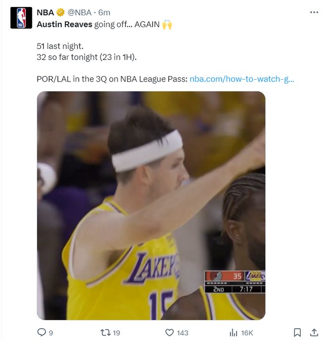 北京时间10月28日,湖人不敌开拓者。此役是湖人背靠背第二场,而且湖人多人伤停,奥斯汀-里夫斯又要独扛一队,三节他再度拿到30+,可末节明显感觉他陷入了疲劳期,连续不中后湖人败下阵来。美媒NBA Memes认为这场比赛的里夫斯就如同18詹皇。