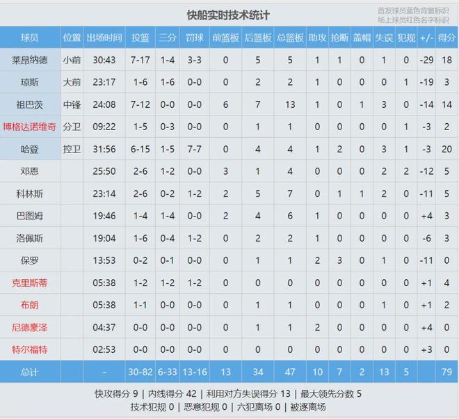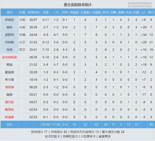 第四节打了一半,快船落后整整20分,泰伦卢换上替补阵容。今年夏天,快船用鲍威尔换来科林斯,又签下大洛佩斯、保罗和比尔,再次成为休赛期总冠军。常规赛开始后,快船又一次让人失望。全场结束,勇士98-79大胜快船。 恭喜勇士,终结了面对快船的7连败。本场过后,勇士4胜1负排名西部第三,快船2胜2负,西部第六。勇士只有4次罚球,结果净胜快船19分。巴特勒21分5板5助、库里19分8助2断、波斯特12分8板;哈登20分1助、小卡18分5板。