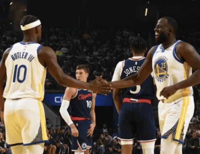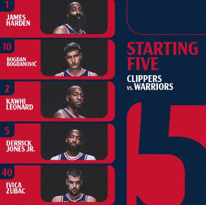 今天比赛,首发阵容方面,勇士队这边,科尔排出的最新首发五人组为:斯蒂芬-库里、乔纳森-库明加、吉米-巴特勒、昆滕-波斯特、德雷蒙德-格林;快船队这边,全员可以出战,首发阵容则为:詹姆斯-哈登、波格丹-波格丹诺维奇、科怀-伦纳德、小德里克-琼斯、伊维察-祖巴茨。