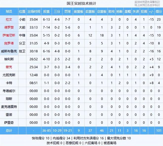 拉文23分4板3助、德罗赞19分1板3助2断、威斯布鲁克16分9板4助、埃利斯12分2板2断、萨博尼斯10分18板3助、蒙克9分2板4助、施罗德8分5板3助、卡特4分1板1助2断、尤班克斯4板 亚历山大31分9板4助3帽、维金斯18分6板6助3帽、米切尔18分1助2断、多特13分5板1助、卡鲁索8分2板3助2断、华莱士8分1板3助、哈尔滕施泰因4分14板3助2帽、杰林-威廉姆斯3分5板4助2断、巴恩海泽2分1板、卡尔森2分1板、扬布拉德1助