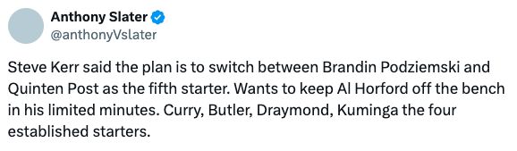 雷速体育10月29日讯 NBA常规赛,勇士98-79击败快船。 赛后采访中,勇士主帅科尔表示:球队计划在波杰姆斯基和波斯特之间轮换担任第五名首发球员,并希望霍福德在有限的上场时间留在替补席上。 在勇士阵容中,库里、巴特勒、库明加和追梦是确定的四位首发。 本场比赛波斯特首发出战25分钟,三分7中4拿到12分8篮板。 |
