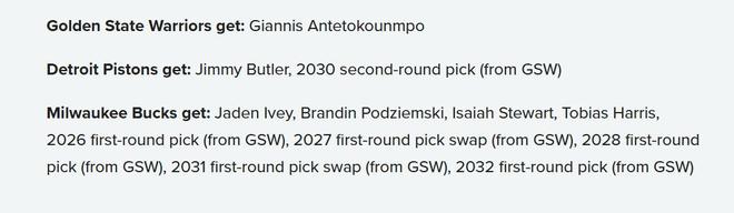 潜在交易方案如下 勇士得到:字母哥; 活塞得到:巴特勒+2030年勇士二轮签; 雄鹿得到:艾维+波杰+斯图尔特+哈里斯+26年首轮(勇士)+27年首轮互换(勇士)+28年首轮(勇士)+31年首轮互换(勇士)+32年首轮(勇士)。