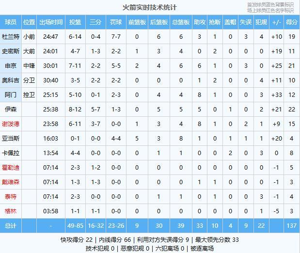 伊森22分5板5助、申京21分6板6助、杜兰特19分6板3助、谢泼德15分4板8助、阿门12分4板8助、史密斯11分4板2断、奥科吉10分1助2断、卡佩拉8分1板2帽、霍勒迪5分、亚当斯4分8板1助、泰特4分1板、戴维森3分1助、格林3分 曼恩21分6板、波特18分4板2助、夏普17分12板2助、马丁11分3板2助、威尔逊9分1板2助、托马斯9分2助、克拉克斯顿6分3板3助、利德尔6分2板、萨拉夫6分1板5助、特拉奥雷4分2板3助、克洛尼2分2板1助